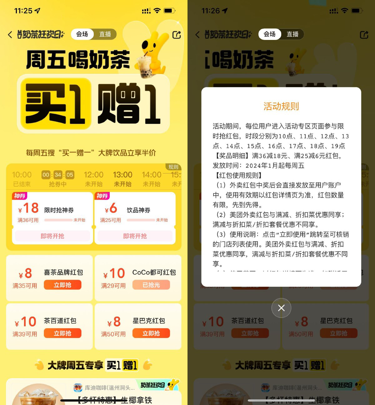 美团外卖APP搜索“买一赠一”->每个整点抢36-18亓券,到今晚19点结束