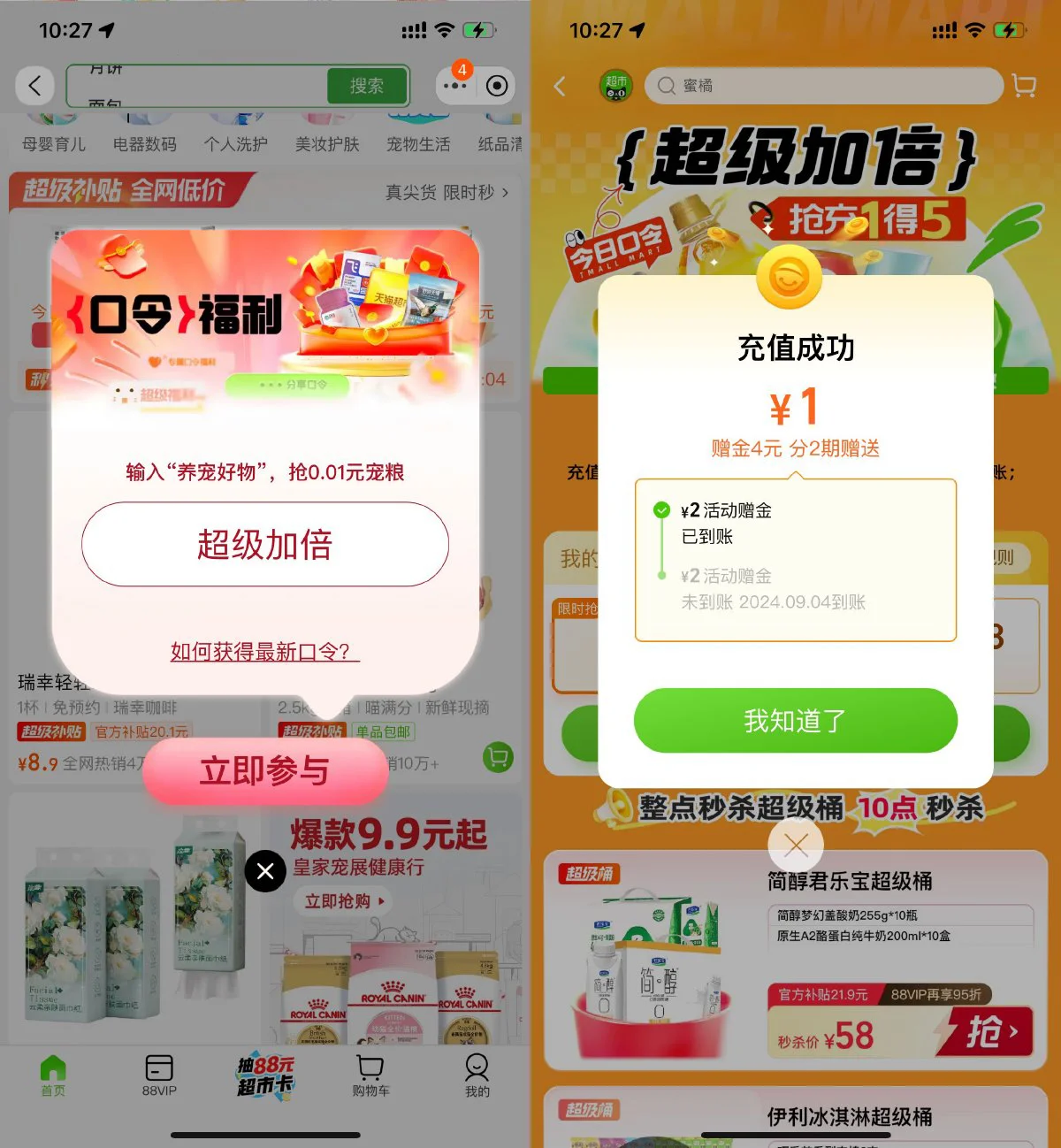 淘宝首页“天猫超市”->右下角惊喜口令输入“超级加倍”->今天有充1送4亓猫超卡,限量5万份先到先得