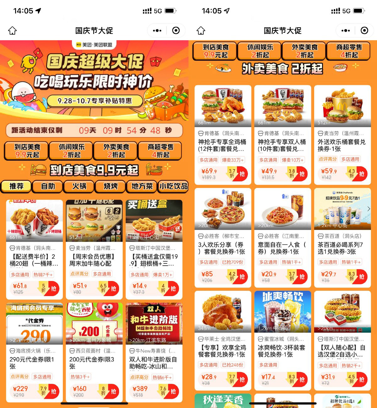 微信打开活动->国庆节有很多补贴美食,以及全国酒店多晚通兑券,貌似挺不错的 刚需的可以上!